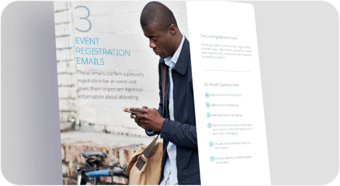 3 The Unenlightened Email: This single email confirms their registration, EVENT provides basic information about the venue and program, and links to the event website REGISTRATION for additional details. EMAILS These emails confirm a person’s registration for an event and IQ Boost Opportunities: gives them important logistical information about attending. Add a pre-event email series Add at-event messaging Add post-event messaging Combine with an event mobile app and location- and time-based push and email messaging Include live content for real-time information Include dynamic content based on behavior