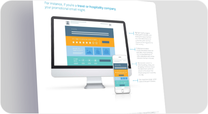 For instance, if you’re a travel or hospitality company, your promotional email might: Highlight loyalty program status, points available, and redemption opportunities— and if the subscriber is not a member, point out that they’re not earning points for their activity. Include personalized recommendations based on past trips, recent browsing, and the travel behavior of other subscribers with similar interests that live in the area. Use dynamic content to include parking, dining, and shopping information about the subscriber’s preferred airport or the airport that they’re using next if currently on a trip. Use responsive design, which caters to frequent travelers. 5 BLUEPRINTS FOR BUILDING SMARTER EMAILS | 7