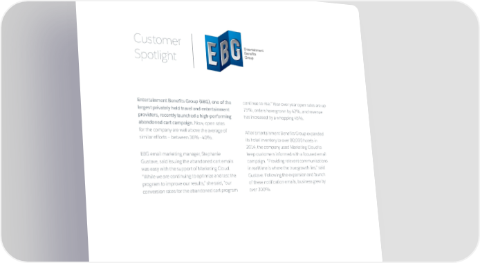 Customer Spotlight Entertainment Benefits Group (EBG), one of the continue to rise.” Year-over-year open rates are up largest privately held travel and entertainment 75%, orders have grown by 42%, and revenue providers, recently launched a high-performing has increased by a whopping 45%. abandoned cart campaign. Now, open rates for the company are well above the average of After Entertainment Benefits Group expanded similar efforts — between 36%–40%. its hotel inventory to over 80,000 hotels in 2014, the company used Marketing Cloud to EBG email marketing manager, Stephanie keep customers informed with a focused email Gustave, said issuing the abandoned cart emails campaign. “Providing relevant communications was easy with the support of Marketing Cloud. in real time is where the true growth lies,” said “While we are continuing to optimize and test the Gustave. Following the expansion and launch program to improve our results,” she said, “our of these notification emails, business grew by conversion rates for the abandoned cart program over 300%. 8 | exacttarget.com