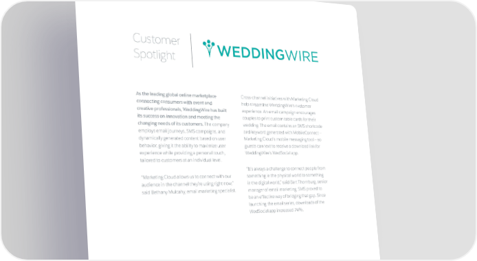 Customer Spotlight As the leading global online marketplace Cross-channel initiatives with Marketing Cloud connecting consumers with event and help streamline WeddingWire’s customer creative professionals, WeddingWire has built experience. An email campaign encourages its success on innovation and meeting the couples to print custom table cards for their changing needs of its customers. The company wedding. The email contains an SMS shortcode employs email journeys, SMS campaigns, and and keyword generated with MobileConnect — dynamically generated content based on user Marketing Cloud’s mobile messaging tool — so behavior, giving it the ability to maximize user guests can text to receive a download link for experience while providing a personal touch, WeddingWire’s WedSocial app. tailored to customers at an individual level. “It’s always a challenge to connect people from “Marketing Cloud allows us to connect with our something in the physical world to something audience in the channel they’re using right now,” in the digital world,” said Bart Thornburg, senior said Bethany Mulcahy, email marketing specialist. manager of email marketing. SMS proved to be an effective way of bridging that gap. Since launching the email series, downloads of the WedSocial app increased 74%. 26 | exacttarget.com