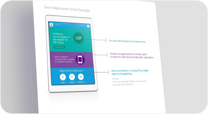 Event Registration Email Example: Include personalized information here. Include an opportunity for mobile opt-in in order to utilize dynamic data after registration. Use a countdown or strong CTA to instill urgency in registering. Example: “Only a few days left. Register now to reserve your spot at Connections.” 14 | exacttarget.com