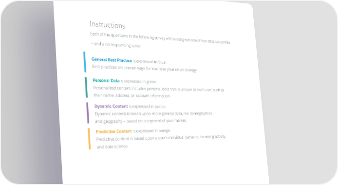 Instructions Each of the questions in the following survey will be assigned one of four data categories — and a corresponding color. General Best Practice is expressed in blue. Best practices are proven ways to maximize your email strategy. Personal Data is expressed in green. Personalized content includes personal data that is unique to each user, such as their name, address, or account information. Dynamic Content is expressed in purple. Dynamic content is based upon more general data, like demographics and geography — based on a segment of your market. Predictive Content is expressed in orange. Predictive content is based upon a user’s individual behavior, browsing activity, and data science. 4 | exacttarget.com