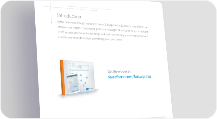 Introduction In the Salesforce thought leadership piece “5 Blueprints for Building Smarter Emails,” we create a road map for constructing great email messages. Now it’s time for you to really dig in. What does your current email design look like? How well do you know your subscribers? Use this workbook to analyze your strategy and get started. Get the e-book at: salesforce.com/5blueprints Build 5 Emails from Blueprint to Greatness | 3