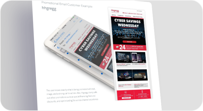 Promotional Email Customer Example: hhgregg The user knows exactly what is being promoted with text, image, and a strong call to action. Also, hhgregg clearly calls out other promotions such as special financing, featured discounts, and opt-in texting for a cross-channel experience. 12 | exacttarget.com