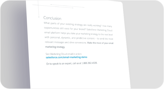 Conclusion What parts of your existing strategy are really working? How many opportunities still exist for your brand? Salesforce Marketing Cloud email platform helps you take your marketing strategy to the next level with personal, dynamic, and predictive content — to send the most relevant messages and drive conversions. Make the most of your email marketing strategy. See Marketing Cloud email in action. salesforce.com/email-marketing-demo Or to speak to an expert, call us at 1.866.362.4538. 24 | exacttarget.com