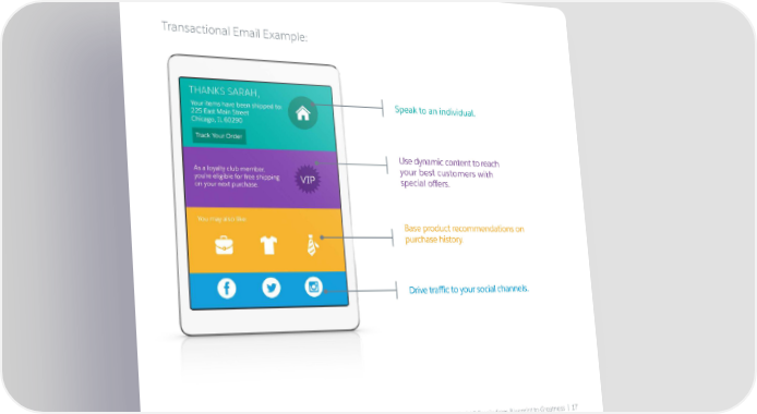 Transactional Email Example: Speak to an individual. Use dynamic content to reach your best customers with special offers. Base product recommendations on purchase history. Drive traffic to your social channels. Build 5 Emails from Blueprint to Greatness | 17