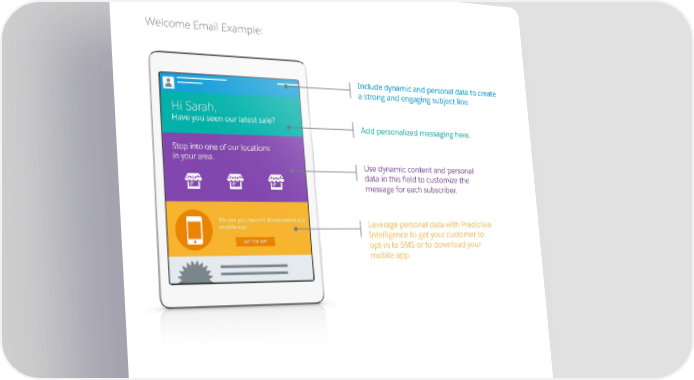 Welcome Email Example: Include dynamic and personal data to create a strong and engaging subject line. Add personalized messaging here. Use dynamic content and personal data in this field to customize the message for each subscriber. Leverage personal data with Predictive Intelligence to get your customer to opt-in to SMS or to download your mobile app. 8 | exacttarget.com